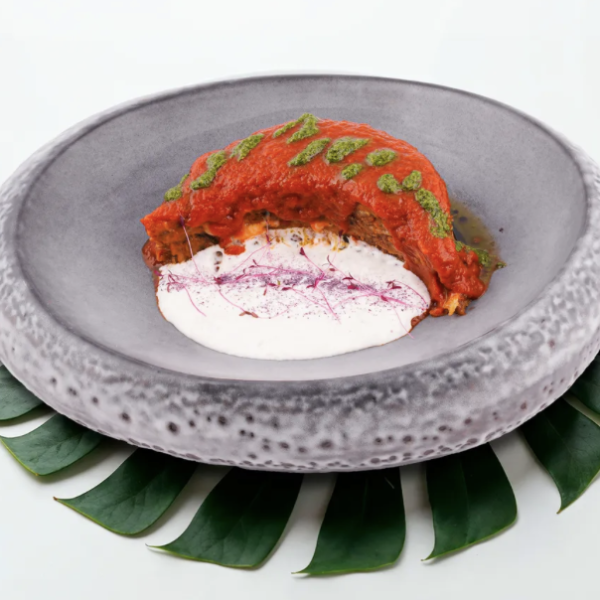 گردن گوسفند پخته شده در سس ملایم و شیرین از آلو، اسفناج با سبزی کوهی