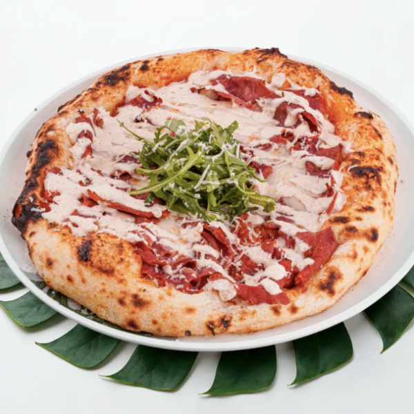 بیکن گوساله، روغن آروماتیک، روکولا، اورگانو، پنیر موزارلا، پنیر پارمسان، سس بیانکا