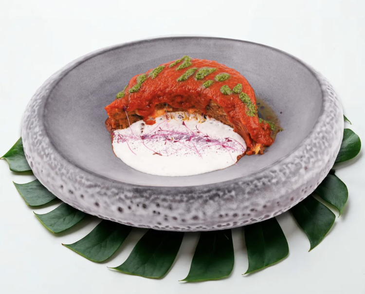 لایه‌های بادمجان برشته، سس گوجه، ریحان ایتالیایی، پنیر موزارلا تازه، سرو با سس پارمسان