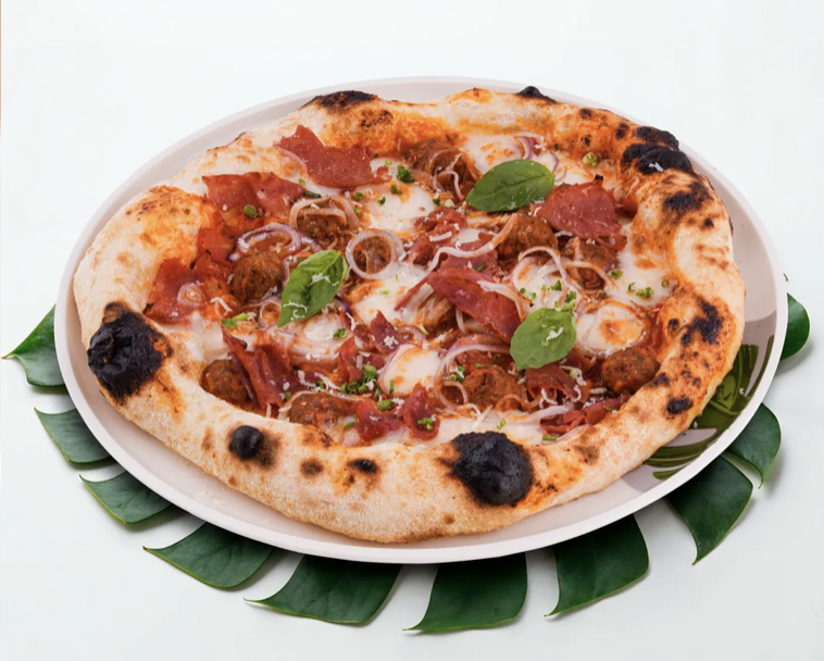 گوشت توپی مزهدار، سس چری، بیکن گوساله، جعفری، پیاز قرمز، پنیر موزارلا، سس مارینار