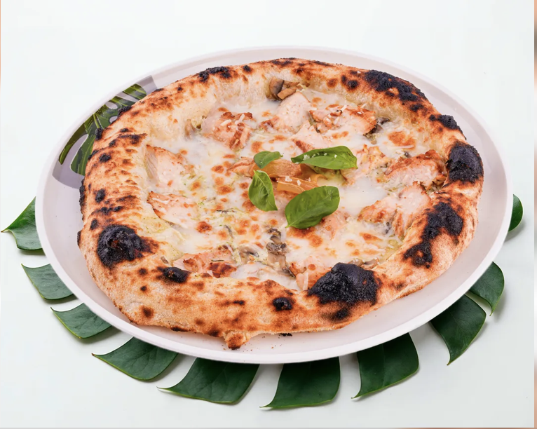سینه مرغ گریل، قارچ، ریحان ایتالیایی، سس کرم پستو، پنیر موزارلا، پنیر پارمسان
