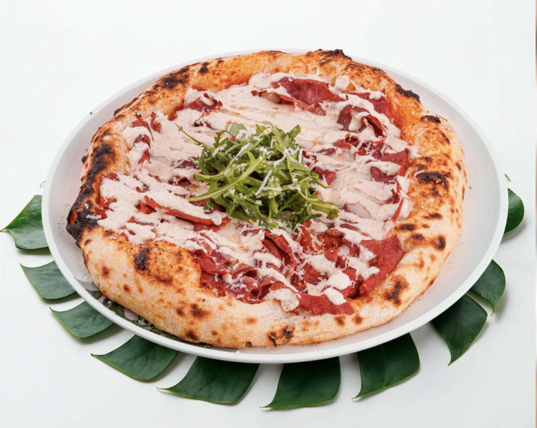 بیکن گوساله، روغن آروماتیک، روکولا، اورگانو، پنیر موزارلا، پنیر پارمسان، سس بیانکا